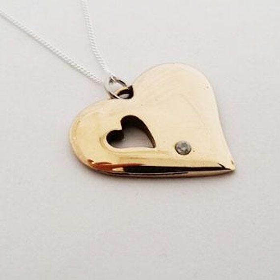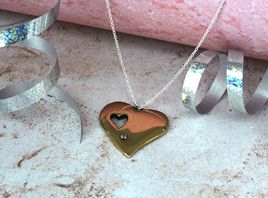 Our polished off-shape heart has a small heart cut out and a diamond embedded at the bottom.