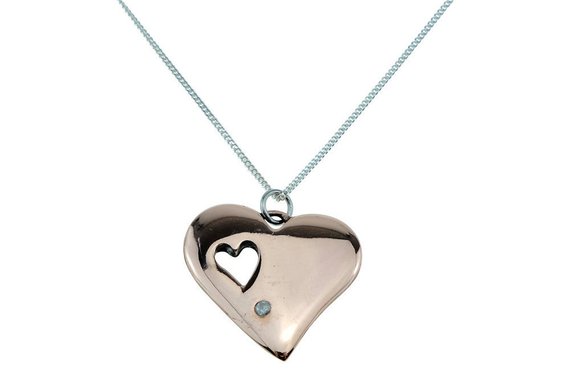 Our polished off-shape heart has a small heart cut out and a diamond embedded at the bottom.