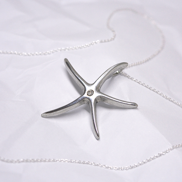 Our starfish is 33mm x 35mm and comes on an 18” sterling silver chain.