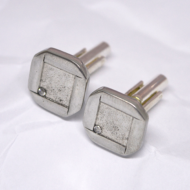 These cufflinks are a completely new design, the octagon is smooth and polished to a shine, the centre of the octagon is left in its natural texture. This mix of polished and raw tin looks great and is a real gem of our collection. In the corner sits a sparkling 2mm diamond.