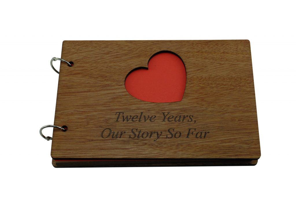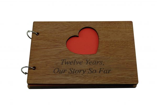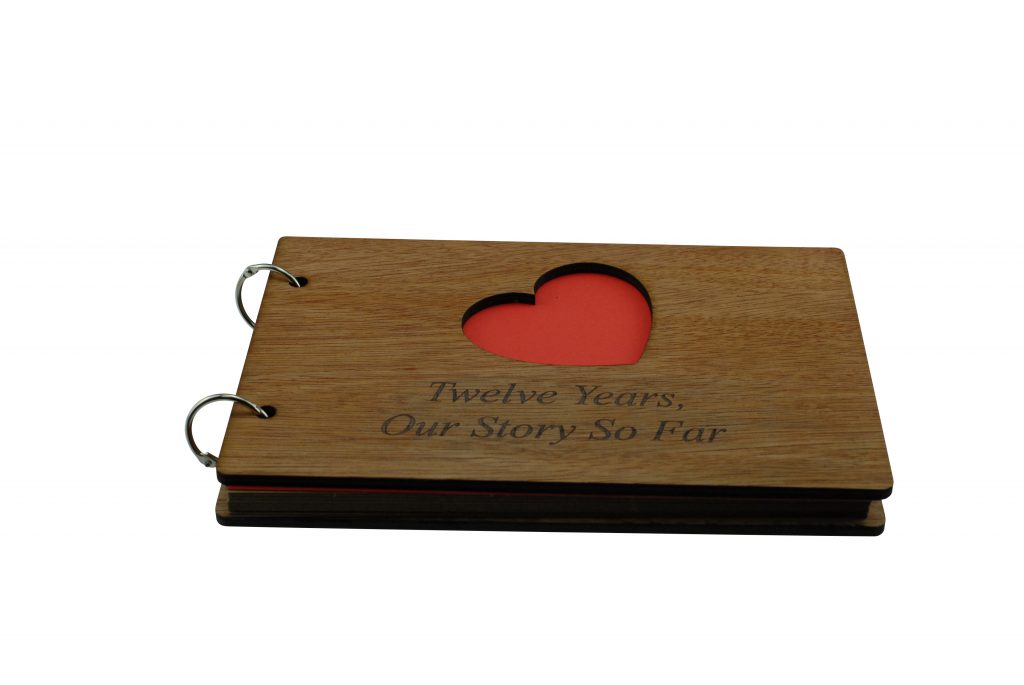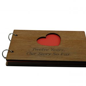 The scrapbook is bound with a quality wooden cover at the front and the back, the front cover has a heart cut out with the inscription laser engraved “Twelve Years, Our Story So Far”.