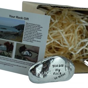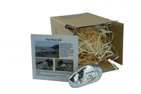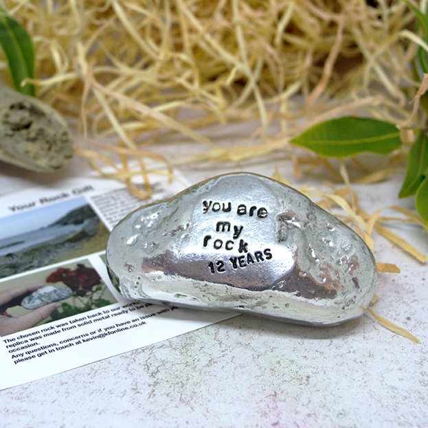 This one of a kind rock was found on a Cornish beach in the summer of 2017, it was picked from thousands of others for its unique shape and style. We took it back to the workshop, made a mould and replicated it in solid metal. We then polish it up and engrave ‘You are my rock 12 years’.