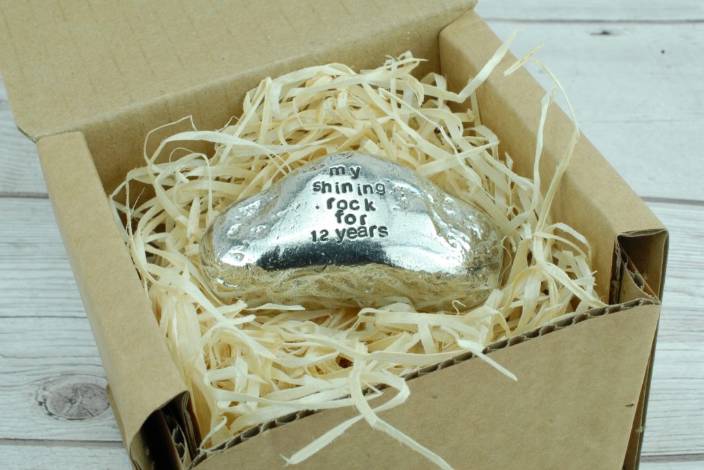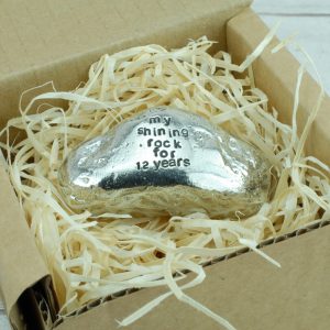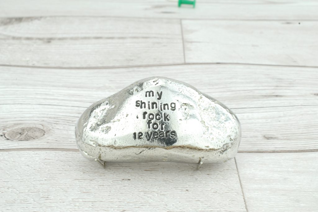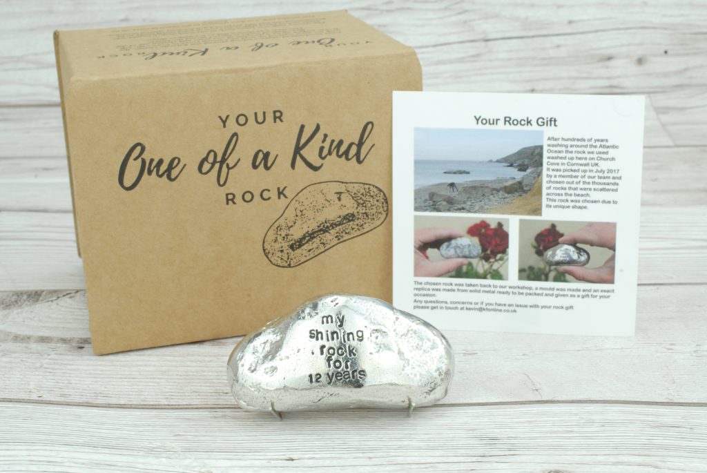 This one of a kind rock was found on a Cornish beach in the summer of 2017, it was picked from thousands of others for its unique shape and style. We took it back to the workshop, made a mould and replicated it in solid metal. We then polish it up and engrave ‘My Shining Rock for 12 Years’.