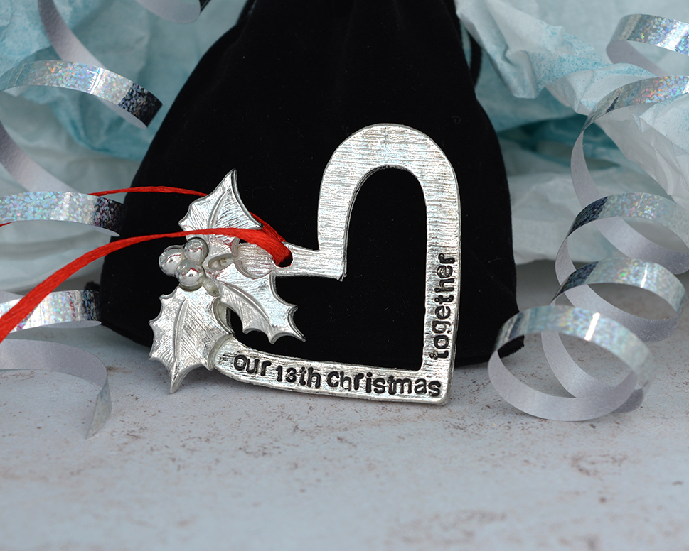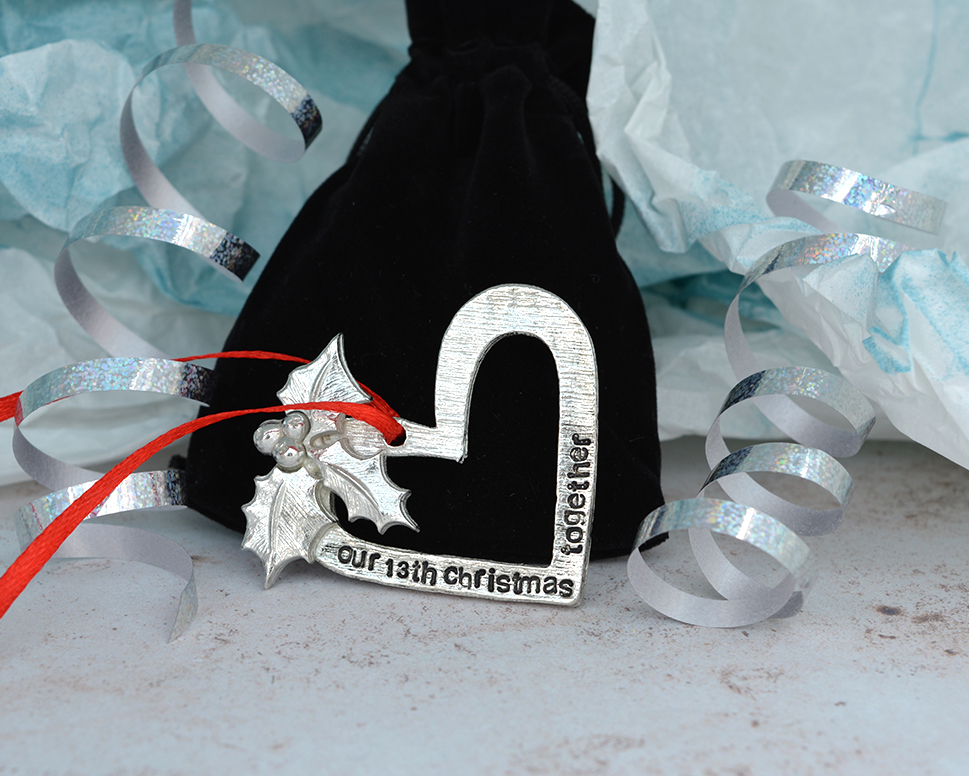 Celebrate your thirteenth Christmas together with this stunning hand crafted decoration, each heart is handmade and uniquely stamped.