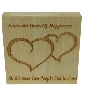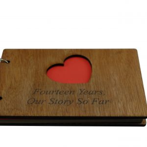 The scrapbook is bound with a quality wooden cover at the front and the back, the front cover has a heart cut out with the inscription laser engraved “Fourteen Years, Our Story So Far”.