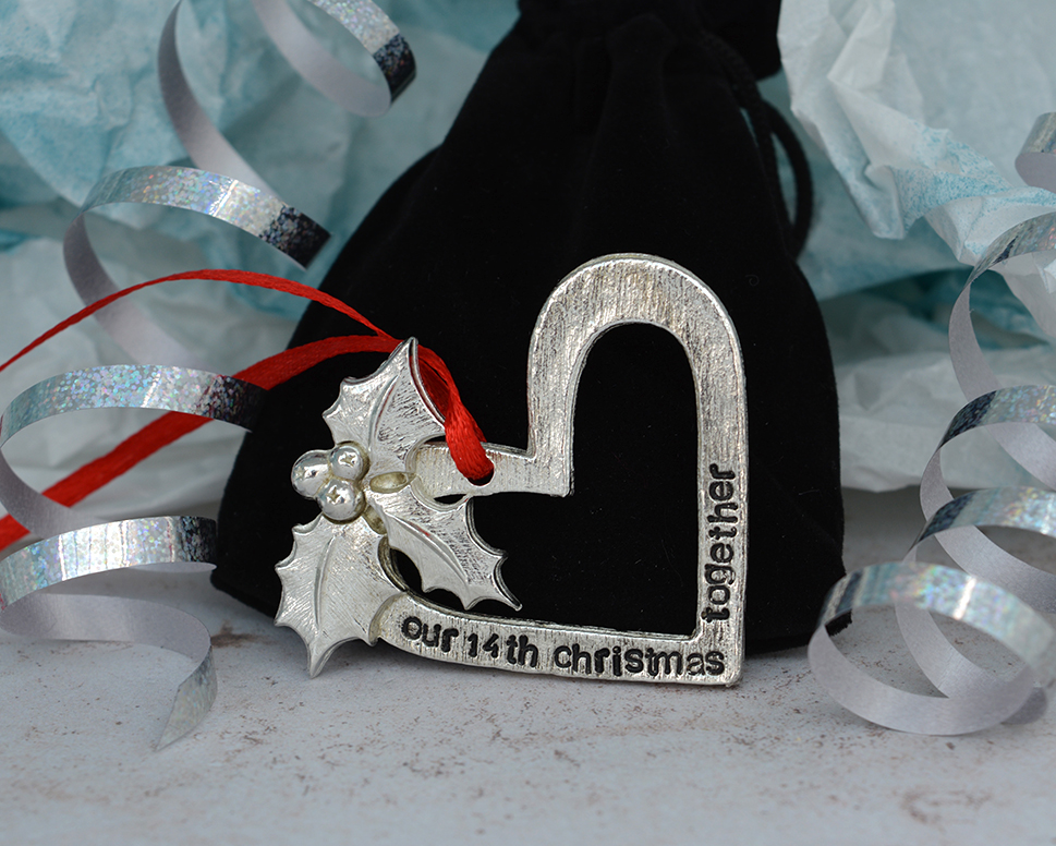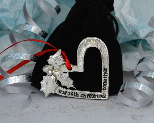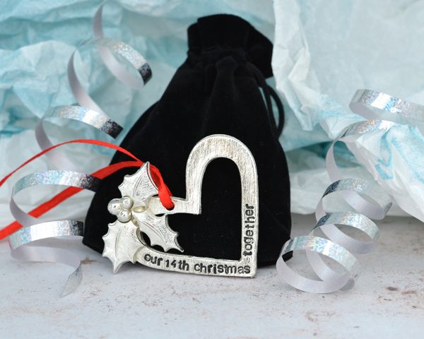 Celebrate your fourteenth Christmas together with this stunning hand crafted decoration, each heart is handmade and uniquely stamped.