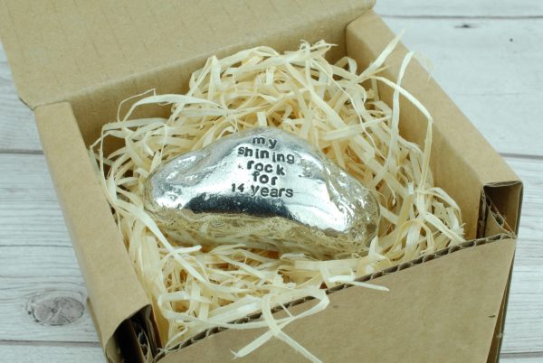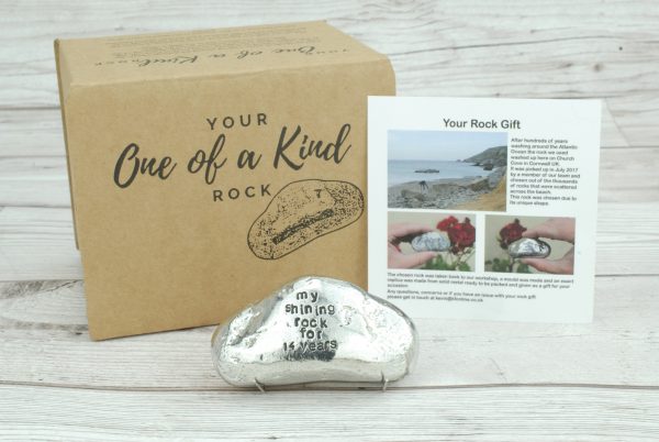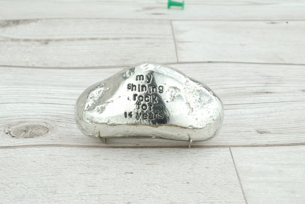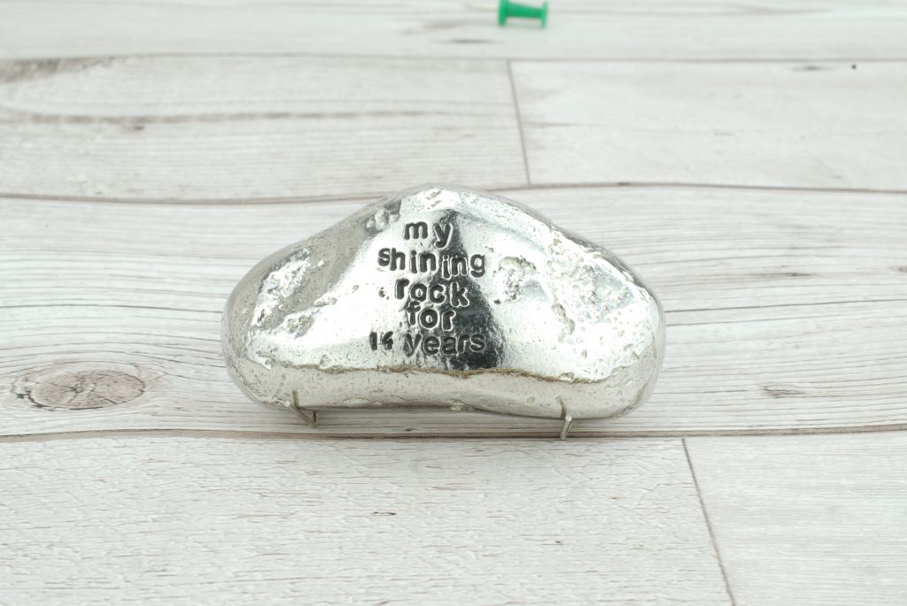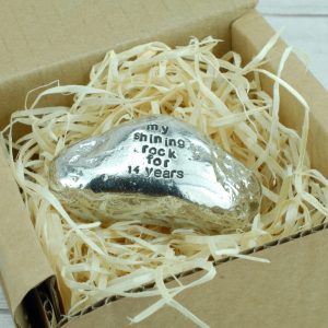 This one of a kind rock was found on a Cornish beach in the summer of 2017, it was picked from thousands of others for its unique shape and style. We took it back to the workshop, made a mould and replicated it in solid metal. We then polish it up and engrave ‘My Shining Rock for 14 Years’.