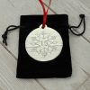 This decoration is 48mm x 48mm it’s 3mm thick and comes with red ribbon to hang.
