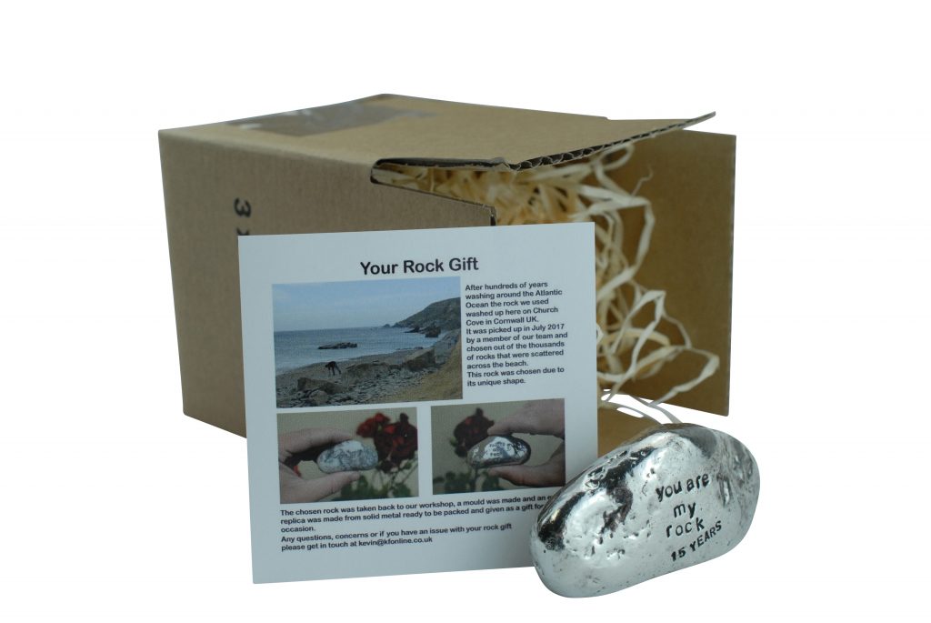 This one of a kind rock was found on a Cornish beach in the summer of 2017, it was picked from thousands of others for its unique shape and style. We took it back to the workshop, made a mould and replicated it in solid metal. We then polish it up and engrave ‘You are my rock 15 years’.
