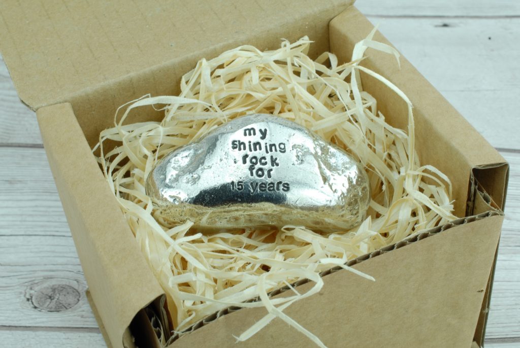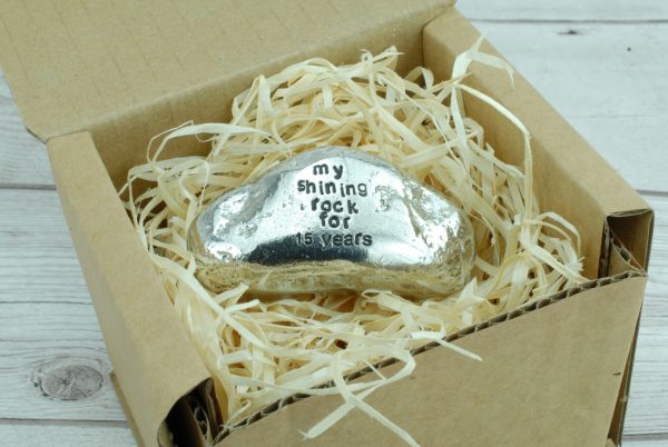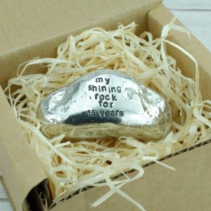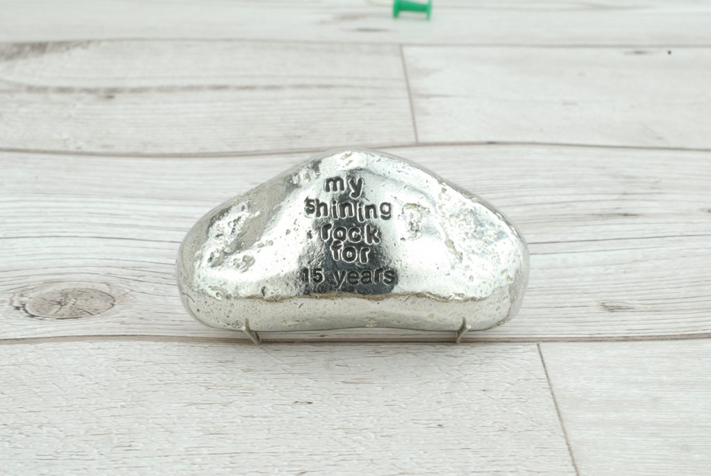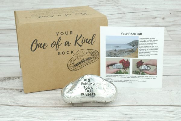 This one of a kind rock was found on a Cornish beach in the summer of 2017, it was picked from thousands of others for its unique shape and style. We took it back to the workshop, made a mould and replicated it in solid metal. We then polish it up and engrave ‘My Shining Rock for 15 Years’.