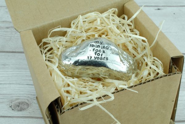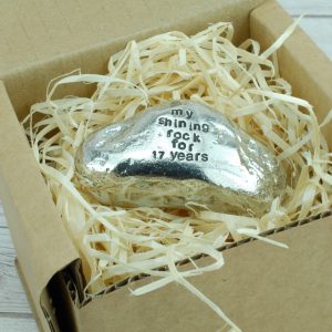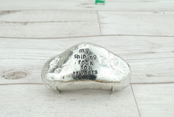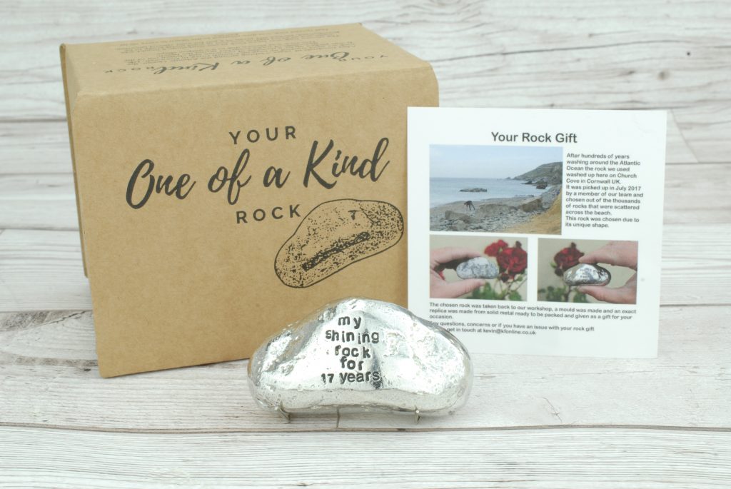 This one of a kind rock was found on a Cornish beach in the summer of 2017, it was picked from thousands of others for its unique shape and style. We took it back to the workshop, made a mould and replicated it in solid metal. We then polish it up and engrave ‘My Shining Rock for 17 Years’.