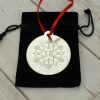This decoration is 48mm x 48mm it’s 3mm thick and comes with red ribbon to hang.