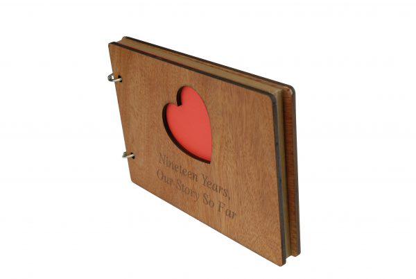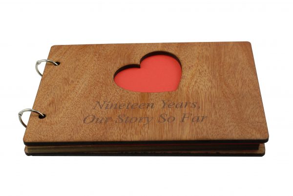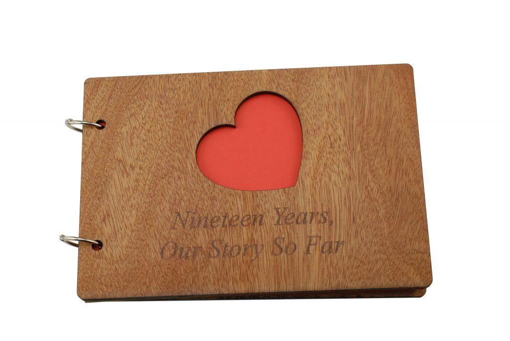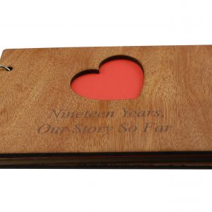 The scrapbook is bound with a quality wooden cover at the front and the back, the front cover has a heart cut out with the inscription laser engraved “Nineteen Years, Our Story So Far”.