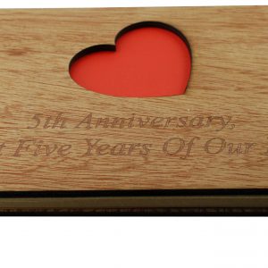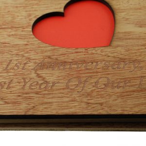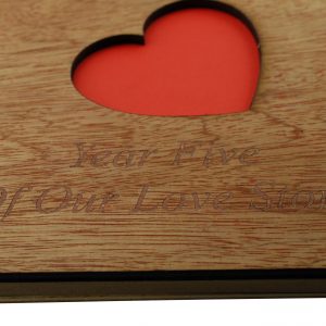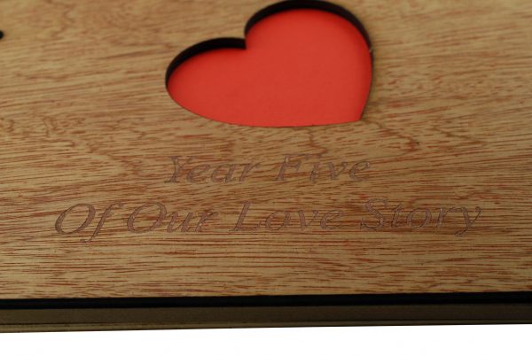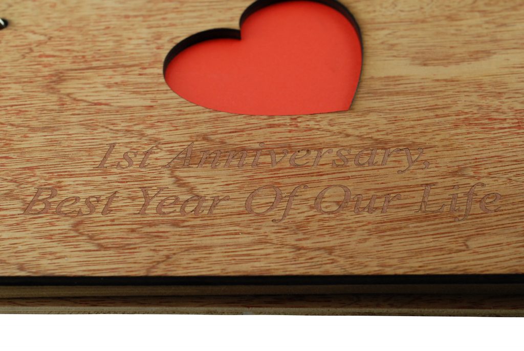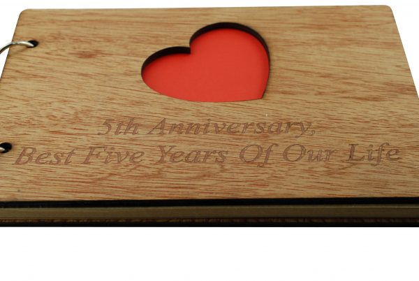 The scrapbook is bound with a quality wooden cover at the front and the back, the front cover has a heart cut out with the inscription laser engraved of your choosing.