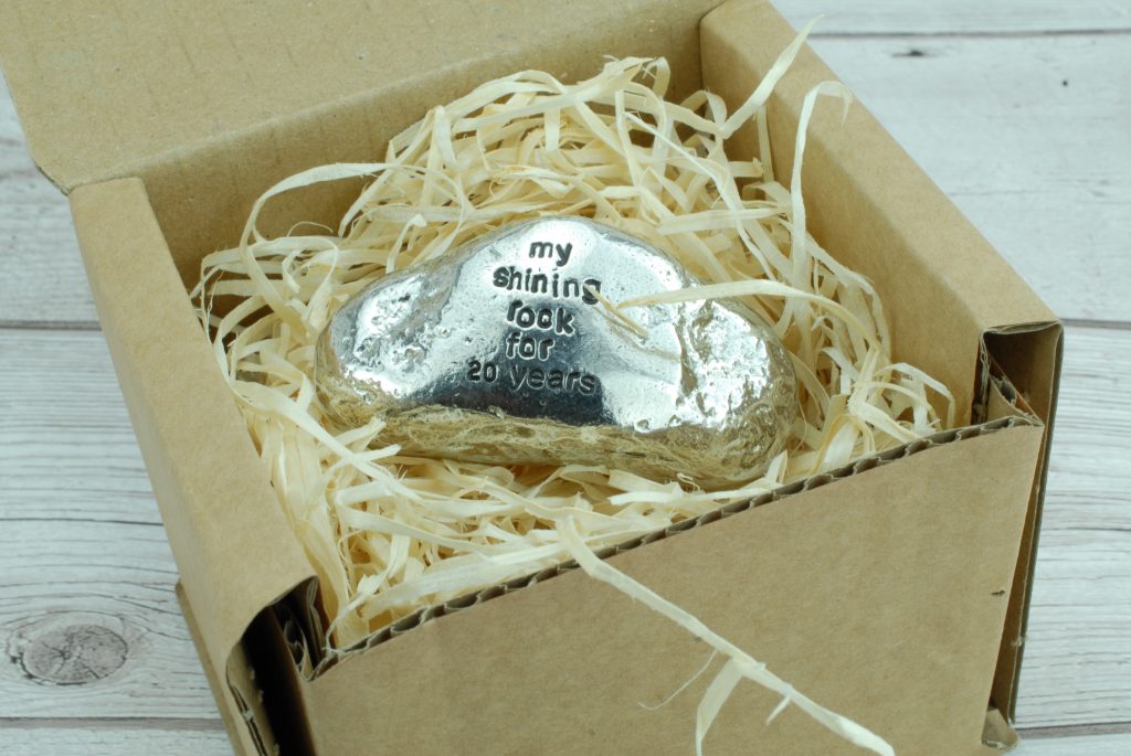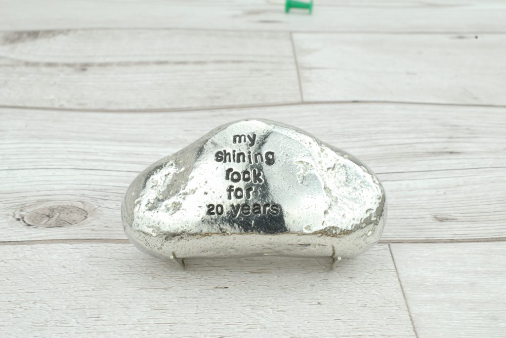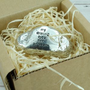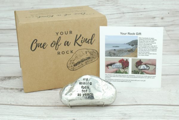 This one of a kind rock was found on a Cornish beach in the summer of 2017, it was picked from thousands of others for its unique shape and style. We took it back to the workshop, made a mould and replicated it in solid metal. We then polish it up and engrave ‘My Shining Rock for 20 Years’.