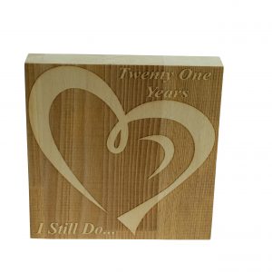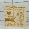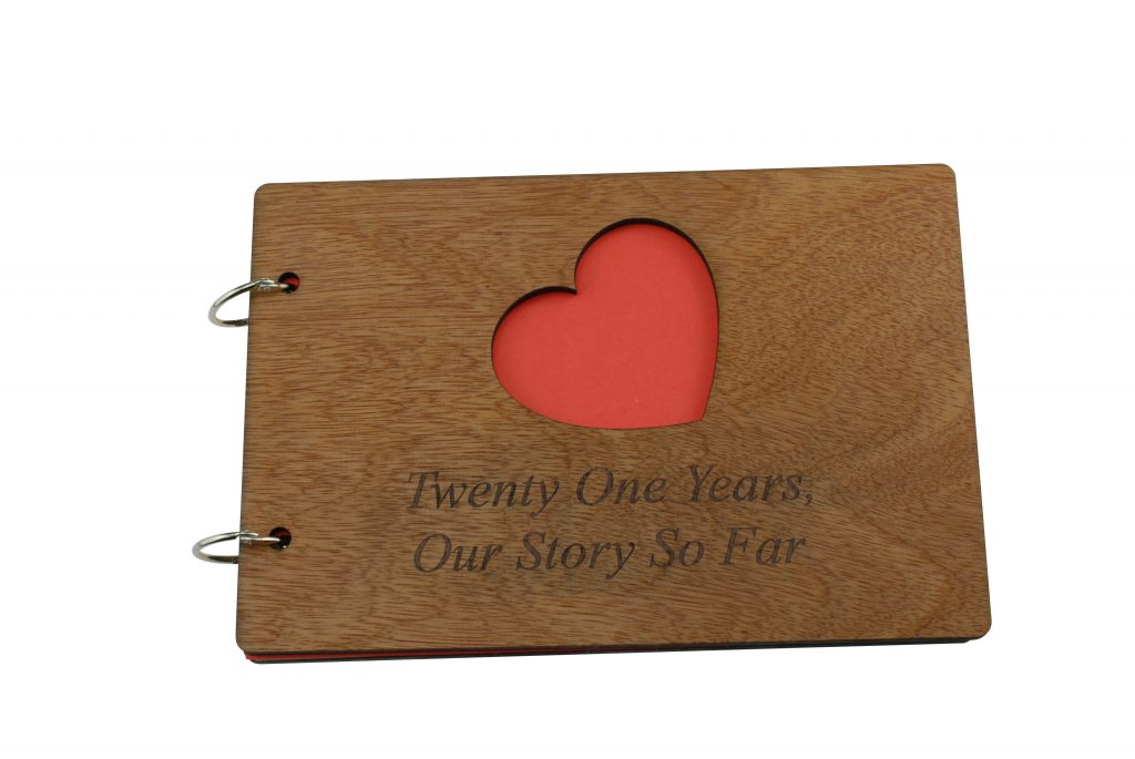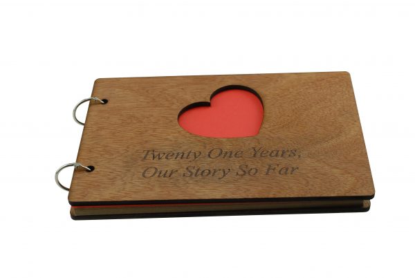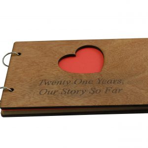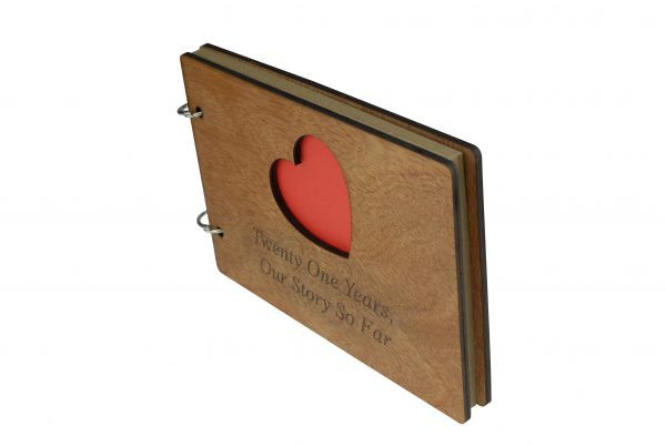 The scrapbook is bound with a quality wooden cover at the front and the back, the front cover has a heart cut out with the inscription laser engraved “Twenty One Years, Our Story So Far”.