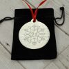 This decoration is 48mm x 48mm it’s 3mm thick and comes with red ribbon to hang.