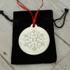 This decoration is 50mm x 50mm it’s 3mm thick and comes with red ribbon to hang.