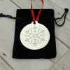 This decoration is 48mm x 48mm it’s 3mm thick and comes with red ribbon to hang.