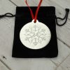 This decoration is 48mm x 48mm it’s 3mm thick and comes with red ribbon to hang.