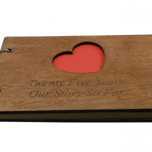 The scrapbook is bound with a quality wooden cover at the front and the back, the front cover has a heart cut out with the inscription laser engraved “Twenty Five Years, Our Story So Far”.