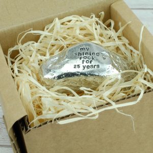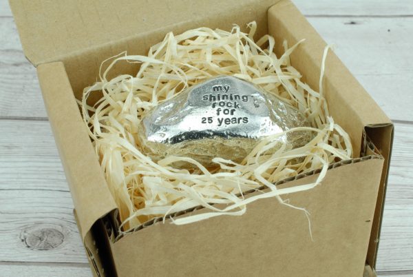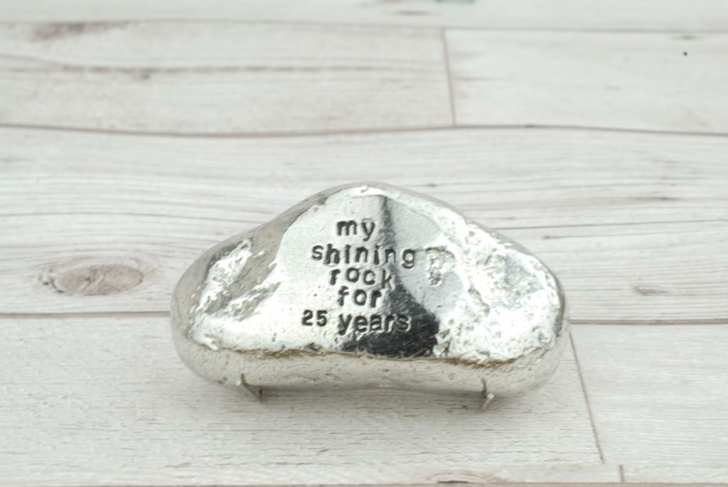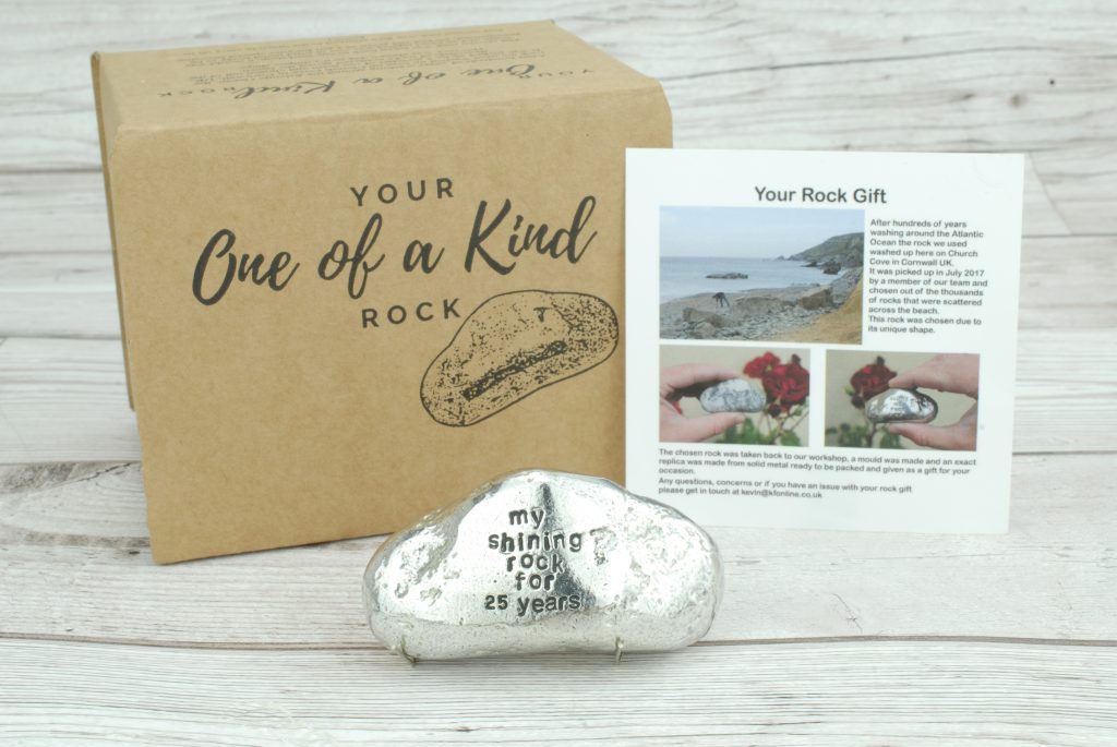 This one of a kind rock was found on a Cornish beach in the summer of 2017, it was picked from thousands of others for its unique shape and style. We took it back to the workshop, made a mould and replicated it in solid metal. We then polish it up and engrave ‘My Shining Rock for 25 Years’.