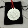 This decoration is 48mm x 48mm it’s 3mm thick and comes with red ribbon to hang.
