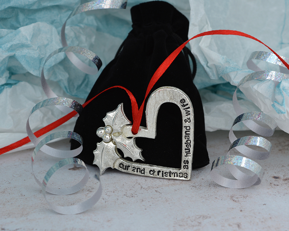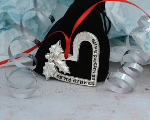 Personalise your Christmas tree this year with this holly and ivy affixed heart. Celebrate your second Christmas together with this stunning hand crafted decoration, each heart is handmade and uniquely stamped.
