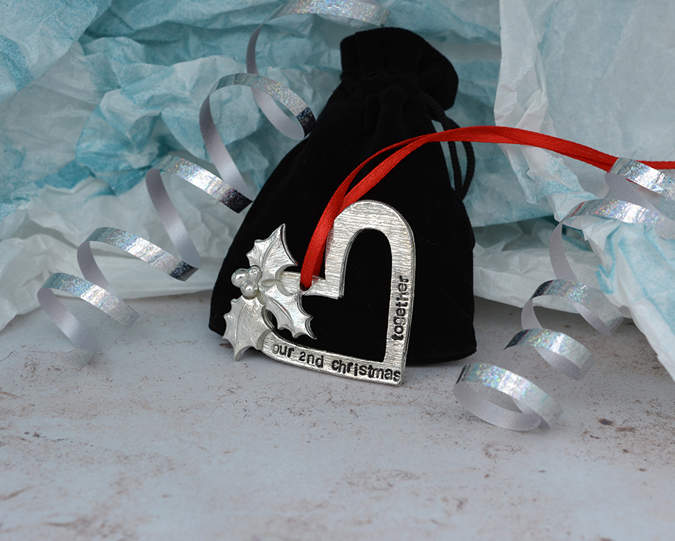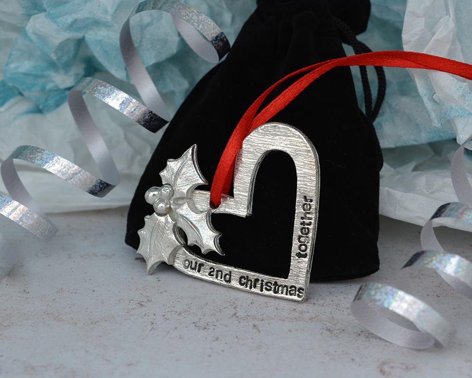 Personalise your Christmas tree this year with this holly and ivy affixed heart. Celebrate your second Christmas together with this stunning hand crafted decoration, each heart is handmade and uniquely stamped.