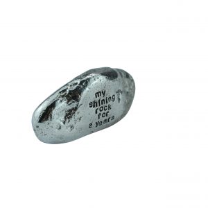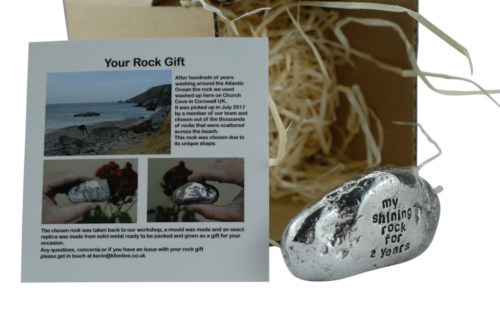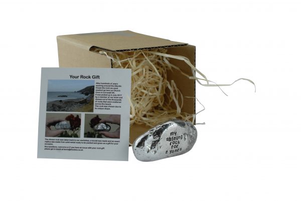 This one of a kind rock was found on a Cornish beach in the summer of 2017, it was picked from thousands of others for its unique shape and style. We took it back to the workshop, made a mould and replicated it in solid metal. We then polish it up and engrave ‘My Shining Rock for 2 Years’.