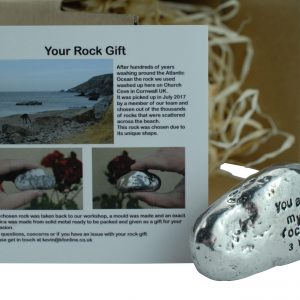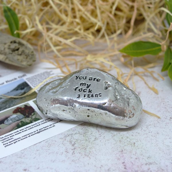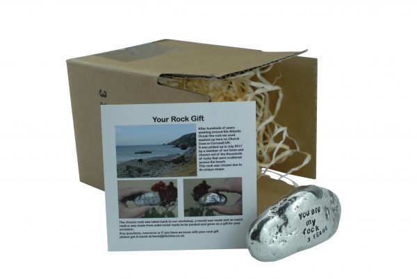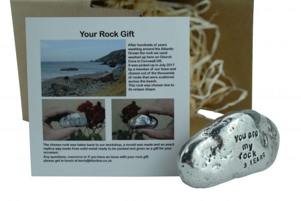 This one of a kind rock was found on a Cornish beach in the summer of 2017, it was picked from thousands of others for its unique shape and style. We took it back to the workshop, made a mould and replicated it in solid metal. We then polish it up and engrave ‘You are my rock 3 years’.