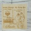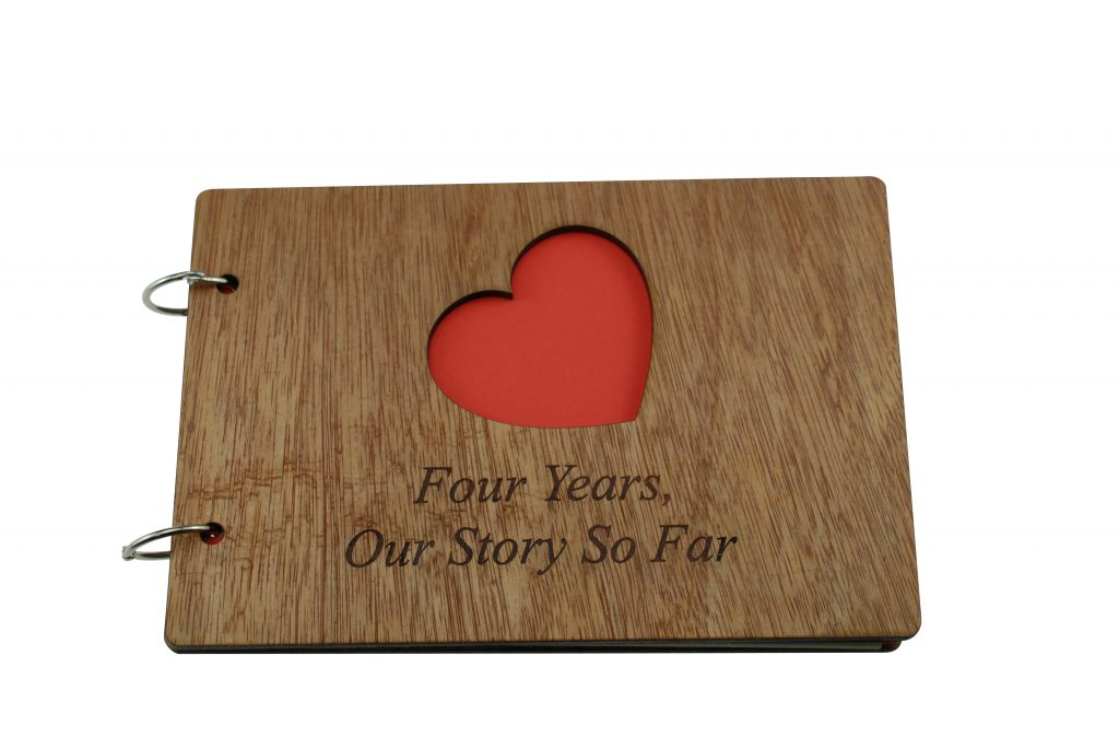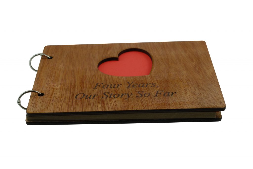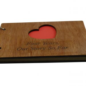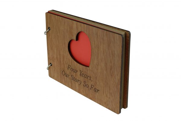 The scrapbook is bound with a quality wooden cover at the front and the back, the front cover has a heart cut out with the inscription laser engraved “Four Years, Our Story So Far”.