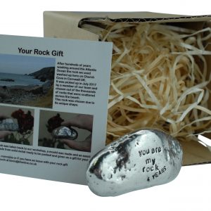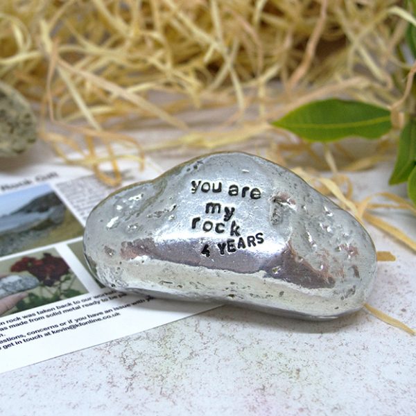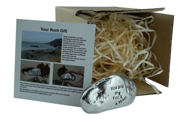 This one of a kind rock was found on a Cornish beach in the summer of 2017, it was picked from thousands of others for its unique shape and style. We took it back to the workshop, made a mould and replicated it in solid metal. We then polish it up and engrave ‘You are my rock 4 years’.