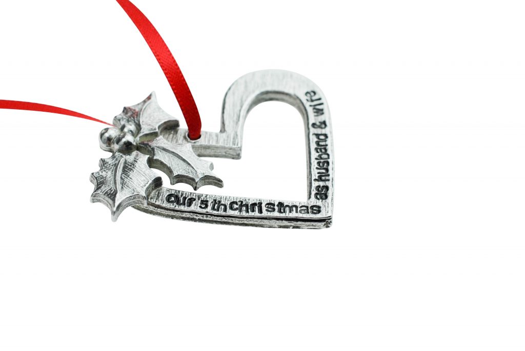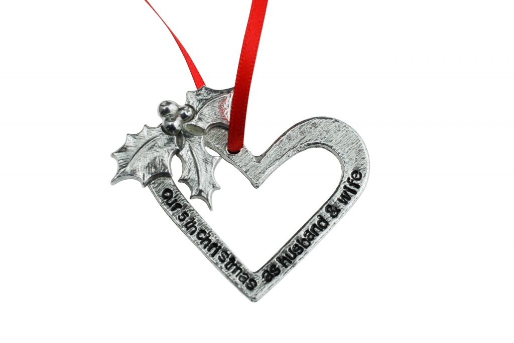 Celebrate your fifth Christmas together with this stunning hand crafted decoration, each heart is handmade and uniquely stamped.