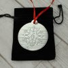 This decoration is 50mm x 50mm it’s 3mm thick and comes with red ribbon to hang.