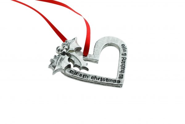 Personalise your Christmas tree this year with this holly and ivy affixed heart. Celebrate your sixth Christmas together with this stunning hand crafted decoration, each heart is handmade and uniquely stamped.