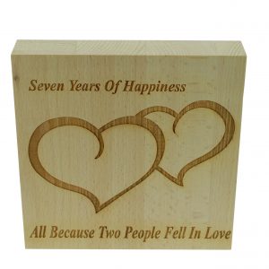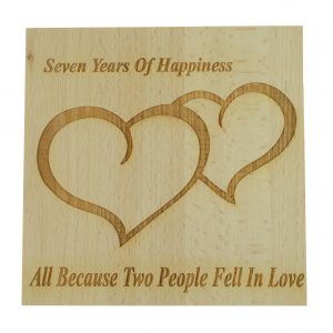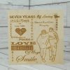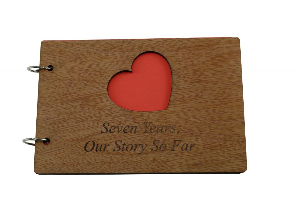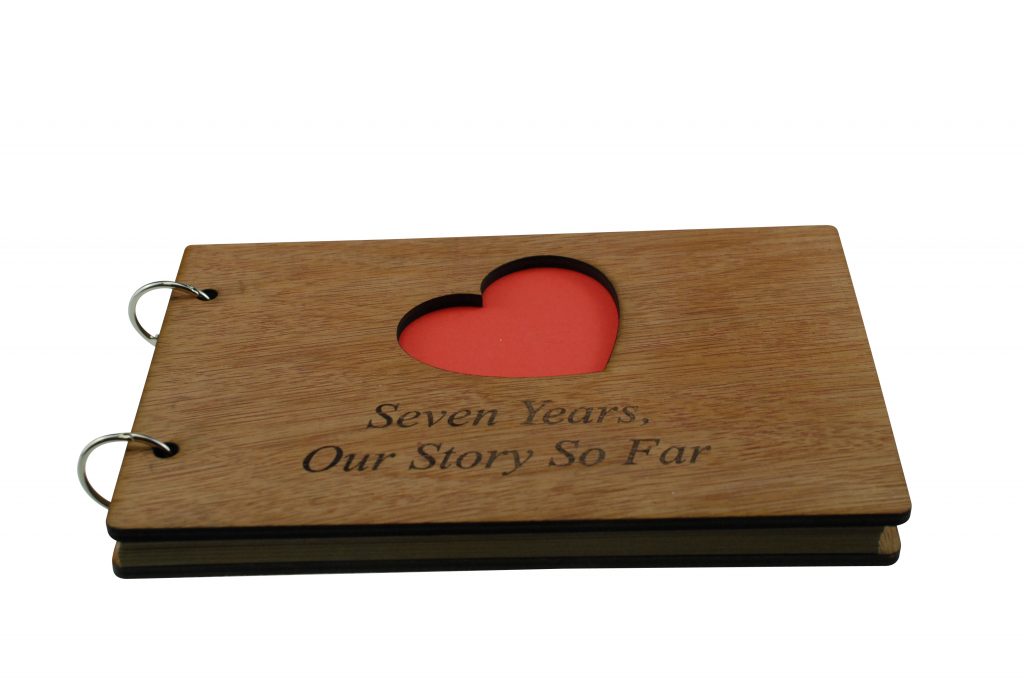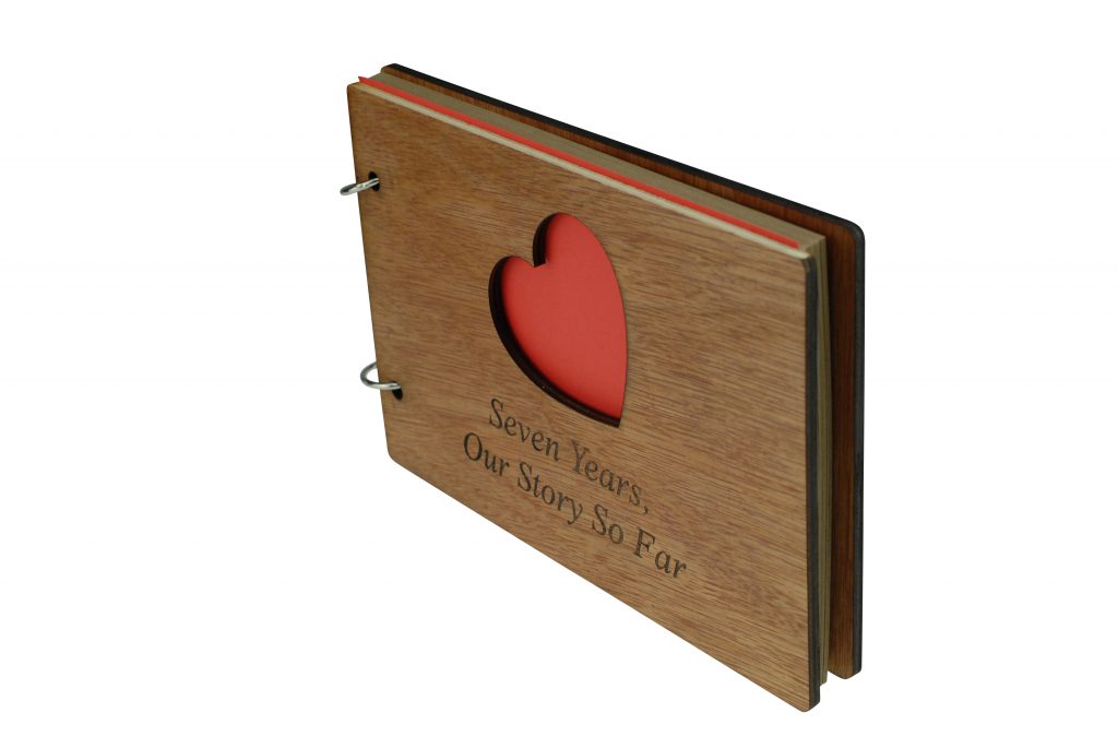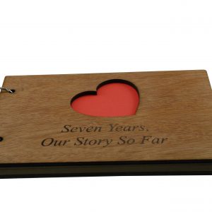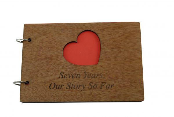 The scrapbook is bound with a quality wooden cover at the front and the back, the front cover has a heart cut out with the inscription laser engraved “Seven Years, Our Story So Far”.