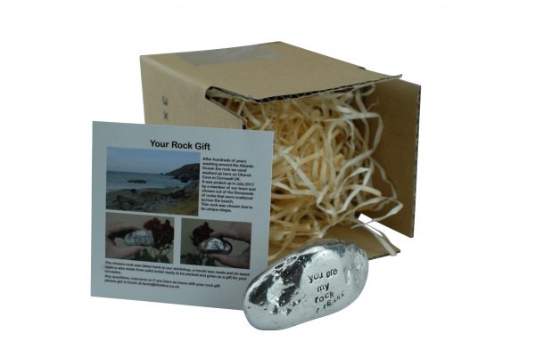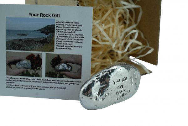 This one of a kind rock was found on a Cornish beach in the summer of 2017, it was picked from thousands of others for its unique shape and style. We took it back to the workshop, made a mould and replicated it in solid metal. We then polish it up and engrave ‘You are my rock 7 years’.