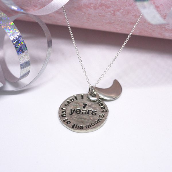 The stunning handmade pendant has attached a petite moon charm, the pendant has printed “I love you to the moon and back” with “7 years” printed in the centre.