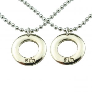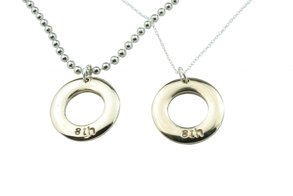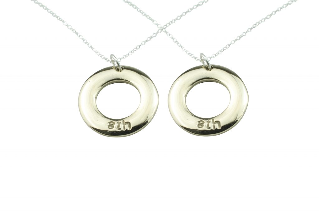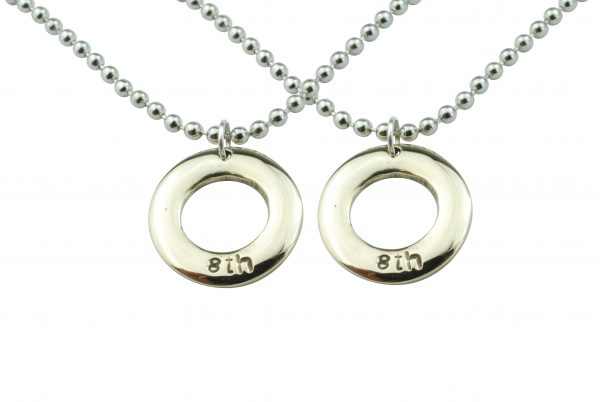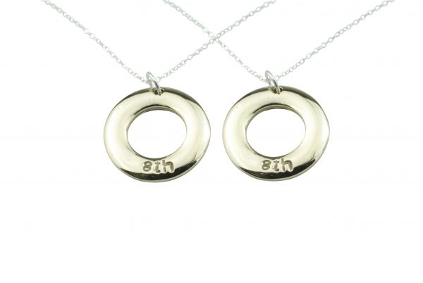 A variation of a pebble and an ellipse together merges to make our minimalist circular pendant. With 8th engraved to celebrate your 8th amazing year.