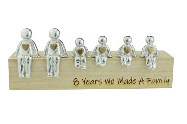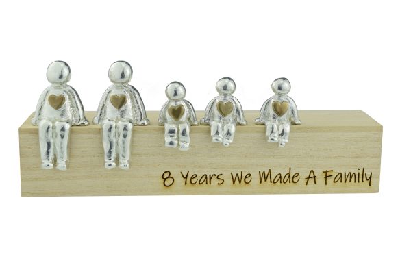 Crafted with care, this design features handmade metal figurines with gold heart detailing, sitting atop a natural wooden base engraved with “8 Years We Made A Family.” It serves as a touching representation of the love, laughter, and memories shared over the years. Whether gifted to a spouse or a couple celebrating their milestone anniversary, this piece is a lasting tribute to the bond of marriage.