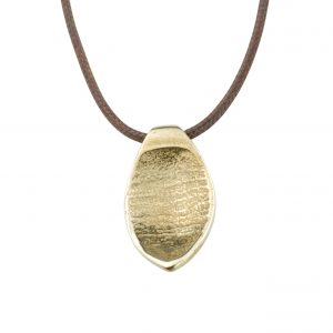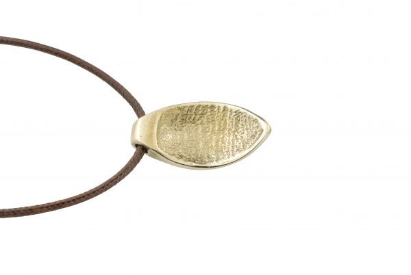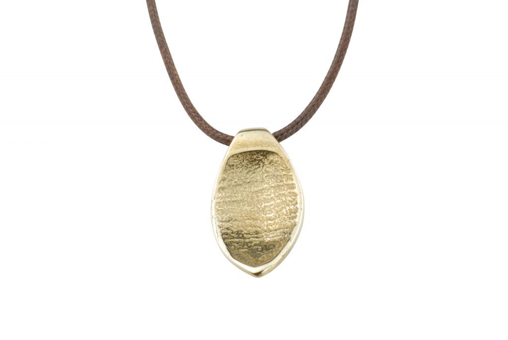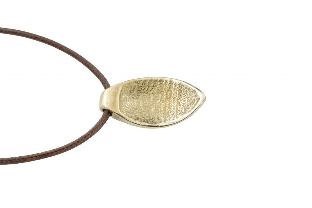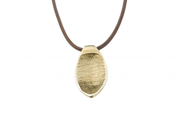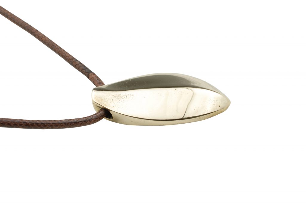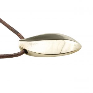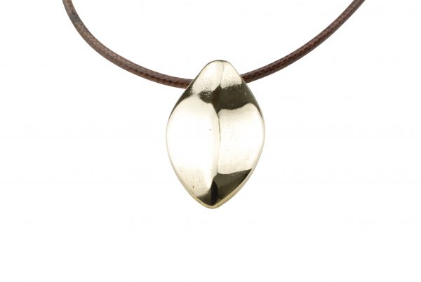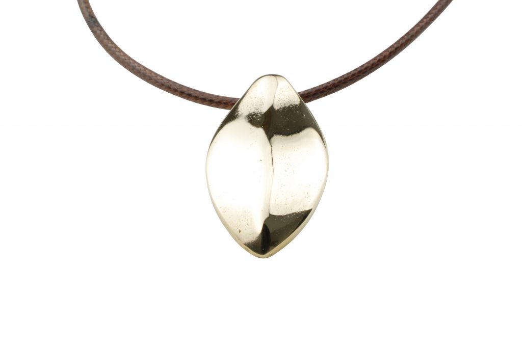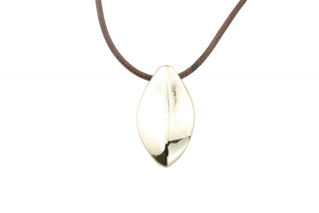 This pendant comes on a 20 inch brown leather cord and is 31mm x 17mm.
