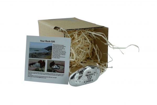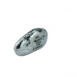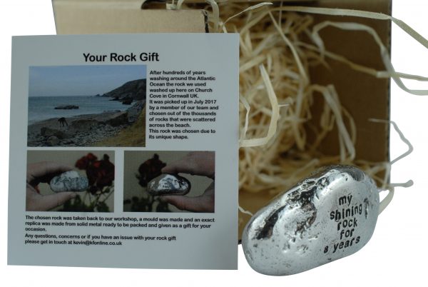 This one of a kind rock was found on a Cornish beach in the summer of 2017, it was picked from thousands of others for its unique shape and style. We took it back to the workshop, made a mould and replicated it in solid metal. We then polish it up and engrave ‘My Shining Rock for 8 Years’.