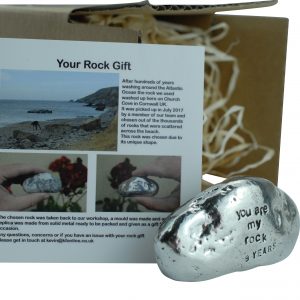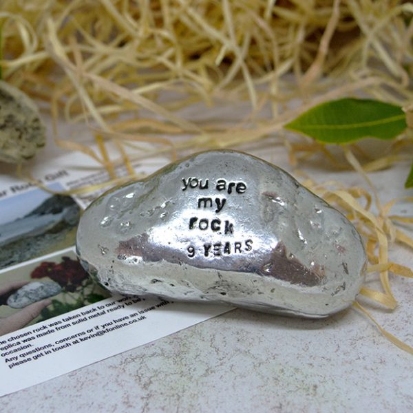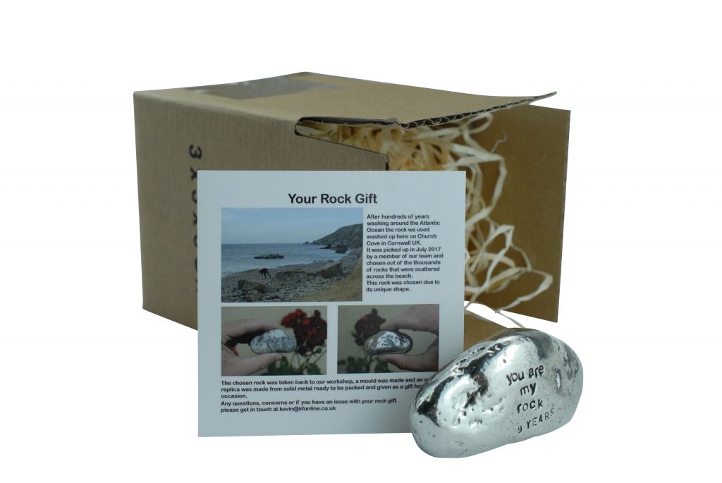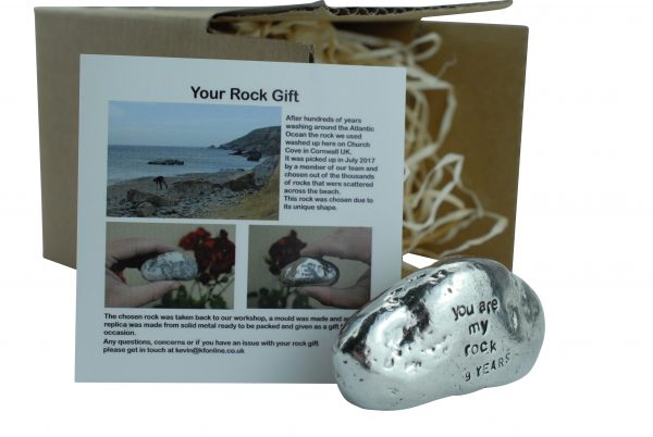This one of a kind rock was found on a Cornish beach in the summer of 2017, it was picked from thousands of others for its unique shape and style. We took it back to the workshop, made a mould and replicated it in solid metal. We then polish it up and engrave ‘You are my rock 9 years’.