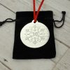 This decoration is 48mm x 48mm it’s 3mm thick and comes with red ribbon to hang.